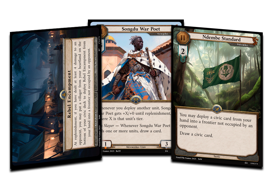 In Empire, you play as a commander striving to build up your a forces and outmaneuver your opponent in three frontiers, capturing the essence of classic strategy games within a card game framework.